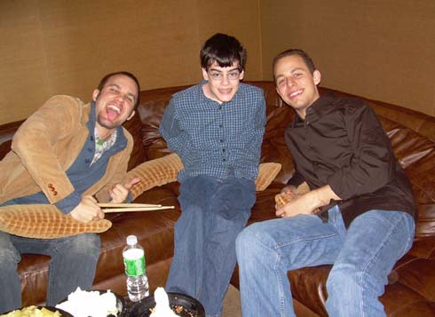 Our adventure actually started on Monday, December 11th when we flew to New York. NBC put us up at the beautiful Parker Meridien New York Hotel, home of the world’s most expensive omelet (for those of you who didn’t hear Matt’s interview). We didn’t order the omelet, but were allowed to keep a menu from the restaurant that describes the omelet (along with the prices). Matt got a kick out of the idea of a $100 and a $1000 omelet, the only difference in price between the two being the amount of caviar on top. I told him he’d have to be a REALLY successful musician to be able to afford even the $100 omelet one day. Also at the Parker Meridien is the burger joint with the best burgers in NY. The little hamburger joint is hidden away behind some curtains on the front lobby so you’d NEVER know it was there. But the restaurant has burgers, fries, and MAYBE hot dogs and chicken. I’m not sure about the last two items. It is a no-frills burger place that has great burgers and fries. Matt DID order one of the burgers and fries! “Late Night with Conan O’Brien” actually tapes from 5:30-6:30 PM, although it airs from 12:30-1:30AM. The amount of work that goes into producing a live television show of that magnitude is tremendous. The day starts EARLY morning for the load-in crew and sound people and members of the guest band. By 7 and 8 AM, people are setting up for the musical act of the evening. Matt’s drummer had to show up at 10 AM to set up his drums the way he wanted. Matt was fortunate. He and I didn’t have to arrive until 2:30 PM. The Bösendorfer piano on which he was to play that evening was delivered and tuned by Bösendorfer New York, so we didn’t have to do anything early in the day. When we arrived at the studio on Tuesday afternoon, we were ushered into a beautiful green room with mountains of food. Matt didn’t perform with his usual sidemen on this particular adventure. John and Steve couldn’t make the performance. So, we hooked up with two local-to-NY college students, Dave Robaire on bass and Joe Saylor on drums. The guys are your typical college students (and starving musicians) and each young man inhaled about 3 sandwiches in the first five minutes we were in the room. They are REALLY great guys and you will be hearing/seeing more of them in the future. Matt needs to have two sets of sidemen on whom he can call at any time for a performance…musicians who know all of Matt’s original tunes and are ready to perform a full gig without any pre-rehearsal. Dave and Joe are such terrific young men (and they MORE than proved themselves with the handling of their last-minute substitution on Matt’s song for the Conan show) that you will see their names linked with Matt’s again in the future. John and Steve are still The Matt Savage Trio as you all know and love them, but Matt needs to have sidemen on whom he can call last minute. And I think you all agree that Dave and Joe do a fantastic job.