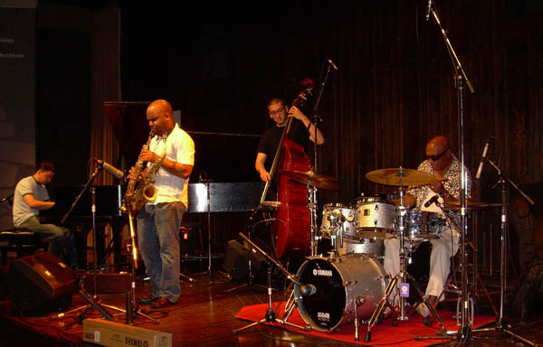 Matt was scheduled to perform at this festival with his “other” sidemen. Matt has historically performed with bassist John Funkhouser and drummer Steve Silverstein. But it is very difficult to juggle three musicians’ schedules sometimes when they are all performing both solo and with other groups. So Matt now has a SECOND set of sidemen. They are bassist Dave Robaire and drummer Joe Saylor. At different gigs he will have different sidemen. And sometimes even that plan goes awry (as on this occasion). Dave and Joe were also scheduled to arrive in Ottawa on the 28th of June from NY. Well, the weather was terrible all along the east coast, and none of the musicians flying out of the NY area could get flights out of NY. Dr. Lonnie Smith’s bass player, Peter Bernstein, was scheduled to fly on OUR flight (which stopped briefly in Newark), and the airline kicked him off the plane…so HE never made it to Ottawa either. Bass players were dumped from planes for three days, as airlines tried to accommodate stranded passengers and would not allow oversized baggage (such as a bass). Joe was somehow able to finagle a flight to Toronto and then from there to Ottawa, arriving very late at night on the 28th. There was no hope for Dave. He did not make it to Ottawa at all. So, Matt had his drummer and no bass player and a play list of mostly original songs. Well, if you are at a Jazz Festival, there is no shortage of jazz musicians. Fortunately, Dave Robaire happened to know a bass player at the festival…the bass player for none other than jazz legend Roy Haynes. He called David Wong, and David graciously agreed to be Matt’s bassist for the evening. Now this was extremely nice of him…especially since Matt’s 1½ hour gig at the National Library of Archives of Canada from 5-6:30 was followed by (who else?), Roy Haynes. David Wong had to perform TWO gigs with minimal rest in between…and that did not include the extra sound check time he spent learning Matt’s songs. Matt and Joe arrived at the venue during Roy Haynes’ sound check, so we all had the joy of listening to a pre-concert concert of the great Roy Haynes and his terrific sidemen. When their check was complete and their equipment was being moved so things could be set up for Matt’s Trio, Matt and Joe met Roy Haynes and hung out with him and his band (including David Wong). As EVERYONE knows, Roy Haynes is an amazing drummer. He is arguably the best drummer out there. He is in his 80s age-wise, but plays his music and lives his life like a 20-year-old. He is quick and funny and interesting and someone who walks (actually strides) into a room and everyone notices. Both Joe (Matt’s DRUMMER) and Matt were kind of tongue-tied and in awe of spending time with Roy and his band. Of course, Joe knew David Wong and had performed with him before, but still we completely understood the enormity of the opportunity we had to talk with Roy and the rest of his band members.