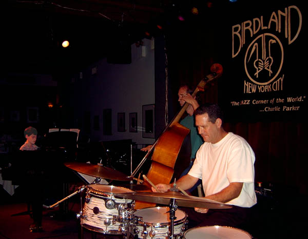 The Matt Savage Trio “officially” released its new CD, “CUTTING LOOSE” on October 4, 2004. Yes, we know the CD was available for purchase before that date; however, the famed Manhattan jazz venue BIRDLAND invited the Trio to do its CD release concert there. We agreed upon a date close to the date when we thought the CD would be available for purchase, but didn’t hit the date exactly. And we didn’t want to hold up availability of the CD. So the “official” release concert was on October 4, even though the CD was already available for purchase. The Birdland concert was actually a “doubly special” evening. Bosendorfer Pianos has just agreed to have a gorgeous 9’2” piano as the in-house piano at Birdland. This piano was played by Oscar Peterson at Birdland a few months ago, and was played by Matt the very next day (at Birdland) on June 22, 2004. Matt played with Clark Terry, Jimmy Heath, Jon Faddis, Marcus McLaurine, and Kenny Washington for a Reading Is Fundamental event. (To learn more about this, read my earlier Birdland article). It was at that time that the owner of Birdland heard Matt perform and invited him to do a gig there with his Trio. As it happened, since Matt is a Bosendorfer artist, he was invited by Bosendorfer to inaugurate the piano’s residence at Birdland on a permanent basis. So, the October concert was both a CD release concert for The Matt Savage Trio and a celebration of the Bosendorfer and Birdland partnership. BIRDLAND!!! Just the name conjures images of the past jazz legends who created jazz as we know it. For those of you who haven’t been to Birdland, it is a fantastic venue in NYC to hear music. There’s not a bad seat in the house. The venue holds 140 people seated at tables. Then there is the bar area, which can hold many more people sitting and standing. The club is clean, the food terrific and the service fantastic. If we lived in NY, we’d be at Birdland listening to jazz every week! Great place. And the Trio felt unbelievably honored to have been invited to perform there.