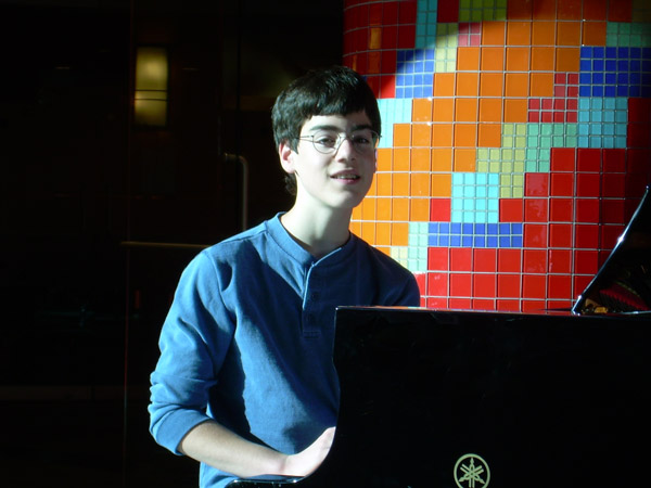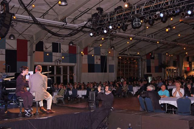 After the video, Barry Morrow took the stage and gave a wonderful speech about Kim Peek, the “real” Rain Man. He then introduced Matt at the piano, discussing everything he had read about Matt on the internet. Barry sat on the piano bench next to Matt and briefly interviewed Matt, “testing” Matt’s ability to identify multiple notes played simultaneously without having to look at the keyboard. Of course, Matt aced the “test” and Barry gave up and invited Matt to play the piano.