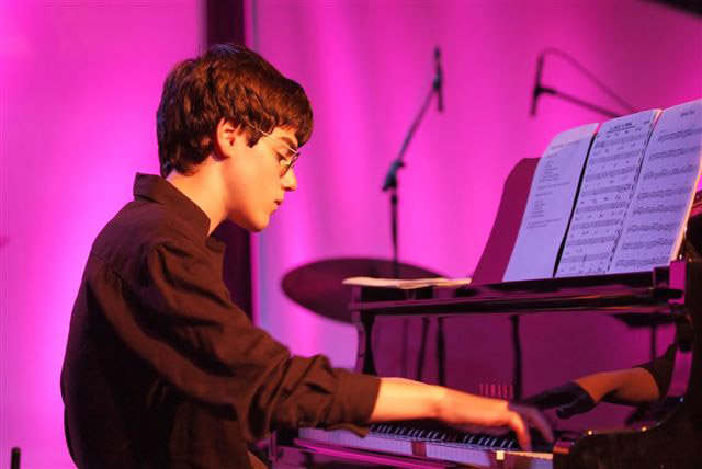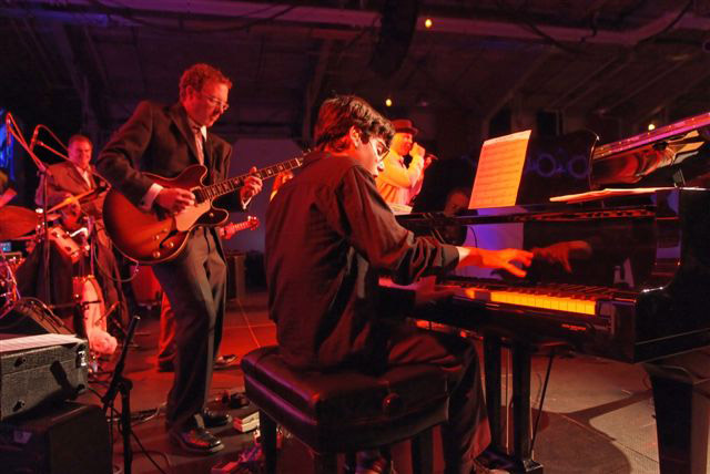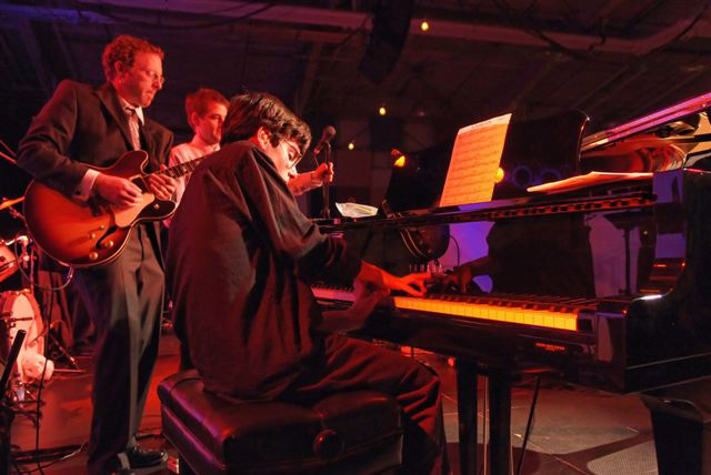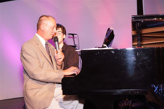 Matt was in a silly mood, so he performed the jazz standard “All the Things You Are” (by Jerome Kern and Oscar Hammerstein II) intermingled with the pop song “Bad Day” (by Daniel Powder). As you might guess, these songs have nothing in common other than Matt, but he seamlessly weaved the tunes as if they were MEANT to be together. It was REALLY cool! There was a little more speaking after Matt’s performance, and then it was DANCE time. Mike Cowie and his band performed a few tunes to get people going, then invited Matt to come up and play the piano with them. This was another highlight for Matt AND the audience. The music being played was all the best dance music out there…from “Mustang Sally” to “Twist and Shout,” to “Dancin’ in the Street”… from the Beatles to Bruce Springsteen to the Rolling Stones to James Brown. I don’t even remember all the songs. The plan was for Matt to join the band for a song or two. But when it became apparent to Mike that Matt learned every song played by the band as they played it the first time around, the band just kept playing with Matt at the helm of the piano! Matt was up there for the rest of the band’s set! As someone who grew up with these great tunes, it was REALLY fun for me to watch Matt getting down and funky, playing rock and roll and blues and learning a WHOLE bunch of “classic” tunes and having a ball! Matt was ALL smiles. And he loved playing the music with the big band, too…replete with a horn section and vocals and everything! Mike, if you read this, THANK YOU for allowing Matt to jam with your band for the evening. Matt had such a great time!