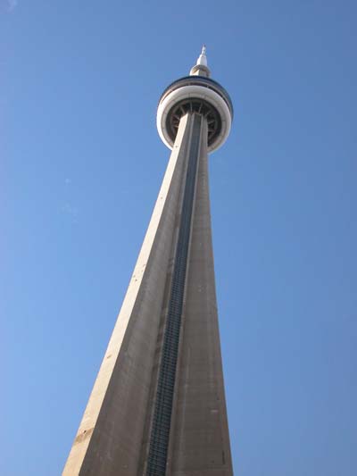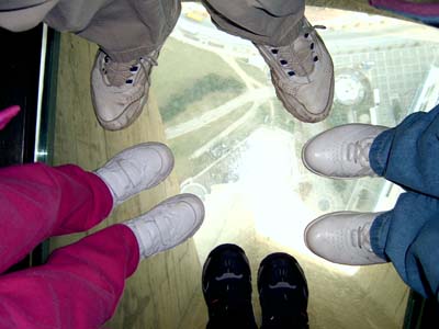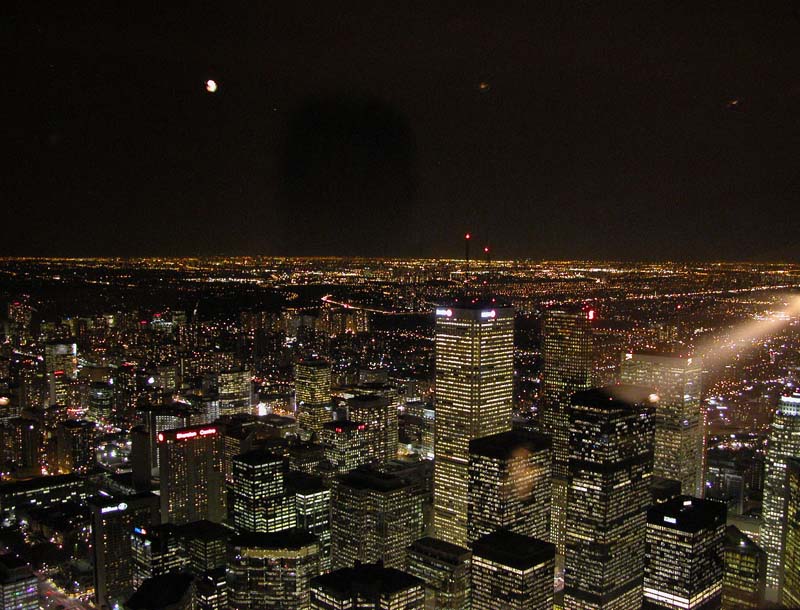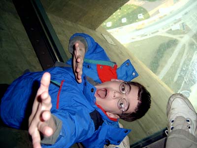 The show hostess, Beverly Thomson, interviewed Matt for a few minutes, and then Matt played a great solo rendition of “Seven Up”. After Matt’s segment we prepared to leave, but managed to see some filming of (and joke around with) the weatherman, Jeff Hutcheson. Matt got a few more hugs from Beverly, one of the nicest ladies you would care to meet, and then we returned to the hotel for lunch. Matt had a brief second meeting with the Toronto Star folks so they could photograph him for their newspaper article. Matt played a few tunes on the hotel lobby piano so the reporter could get people’s reactions to his playing. It was kind of cool. People stopped what they were doing and crowded around and listened and applauded. We received a few business cards, and as we were leaving, a local jazz musician who was in the lobby introduced himself and said of Matt, “He’s Got Chops”. Let me tell you, folks, this statement is the ultimate compliment in jazz. One of the greatest forms of recognition in the music world is gaining the respect of the greats who precede you. Anyway, after that, we were off to the CN tower for the rest of the day and into the night. We went to the Skypod, which is really cool. You are SO, SO high up. It is the world’s highest observation deck at 1465 feet in the air. Then we went to the glass floor and observation deck. If you thought I said glass floor, you were correct. There is a section of the tower that has a floor made of glass. You can stand or even jump on this floor, but directly below you (approximately 1122 feet below you) is the pavement. You look down below your feet, and it is STRAIGHT down! If you can conquer your fear of heights, this makes for come cool photo ops. Here are a few of ours. (Don’t worry. The literature about the glass floor says it can hold 14 hippos. I just hoped we weren’t the 15th)!